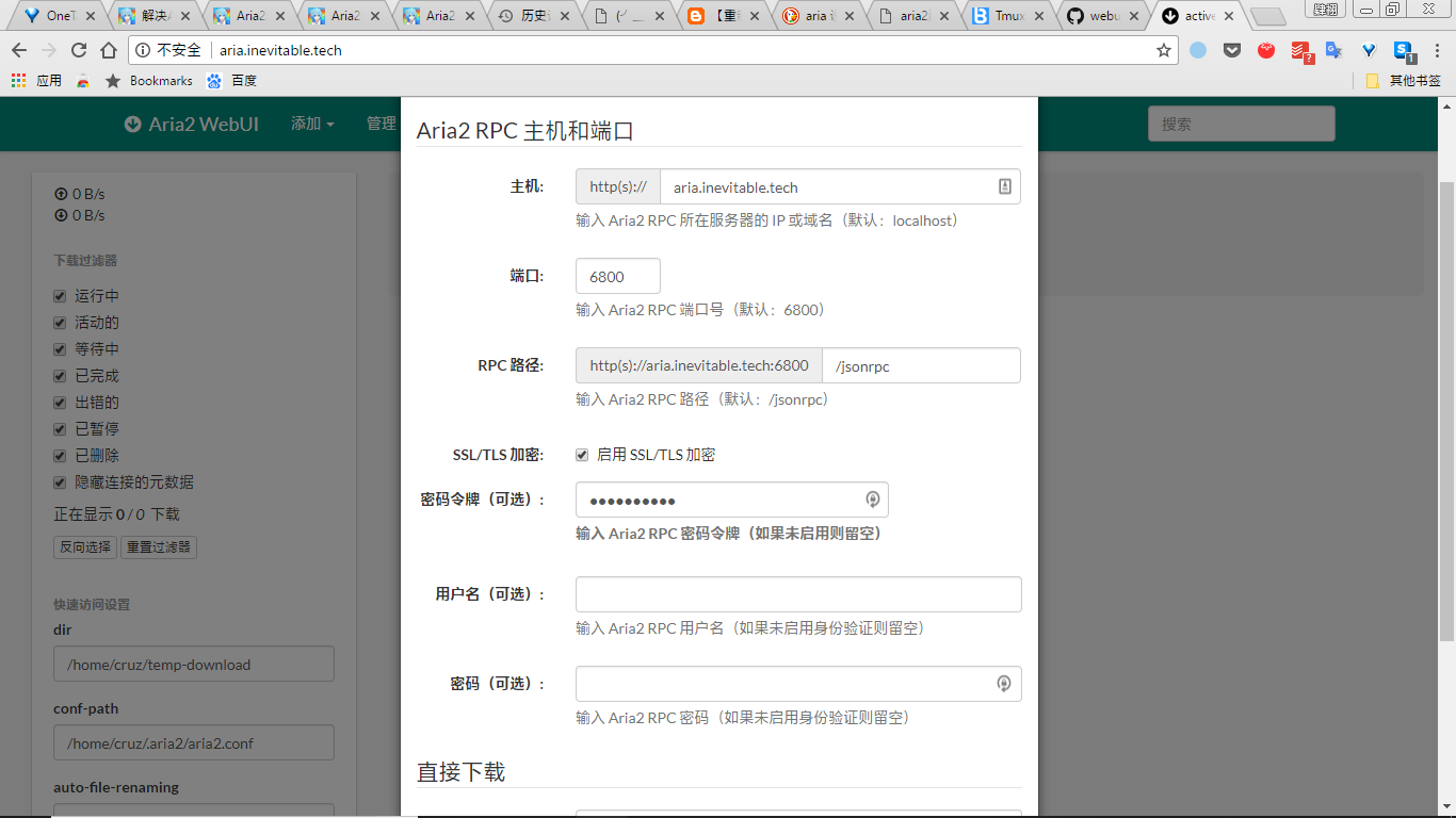 访问youserverip:6800 左侧max-connection-per-server可以设置的最大值为16。 如果configuration.js中的encrypt设置为了`true,需要勾选启用 SSL/TLS 加密。