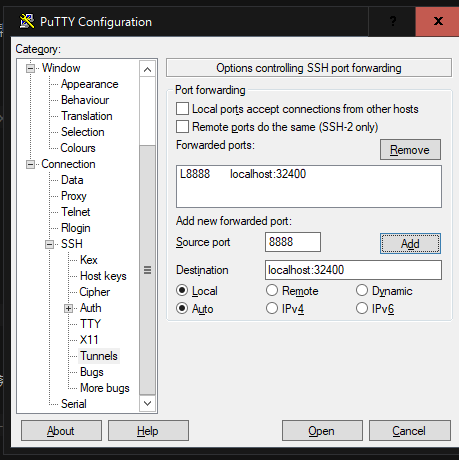 启动Plex service plexmediaserver start 注意打开端口。 因为Plex只支持本地访问并配置,所以我们使用ssh隧道进行连接并且配置。 在这里我使用的是putty。首先正确配置putty,保证可以连接到服务器。 配置SSH Tunnels。